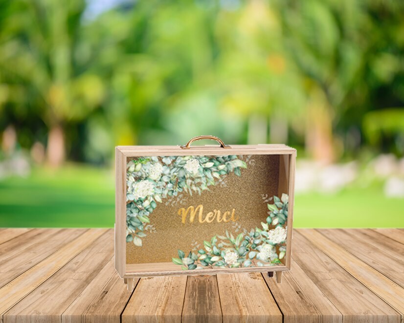 - Urne de mariage : Les invités peuvent y déposer leurs cartes de vœux ou leurs dons. C’est une tradition courante dans de nombreux mariages. Le design floral et le mot “Merci” ajoutent une touche personnelle qui peut s’harmoniser avec le thème du mariage.